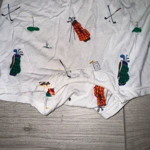 Adorable baby romper with a golf theme. Features colorful golf clubs and balls on a white background. Perfect for little golf enthusiasts.