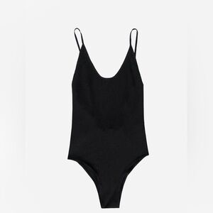 ANGIE BAUER, Size XS. Sleek, scoop "ballerina-off-duty" bodysuit with power mesh panels at the open back. Has adjustable elastic straps. Step in through waist. Mindfully crafted in California. Worn with the Ciao Lucia Leopard Carlotta Skirt and By FAR Tanya Mule.