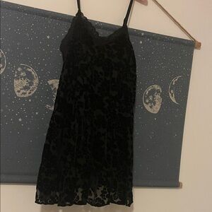 Elegant black burnout velvet lace slip dress with delicate straps. Perfect for layering or wearing alone.
