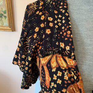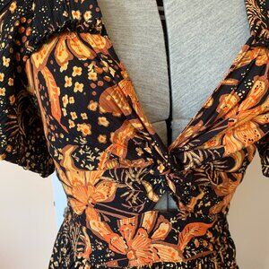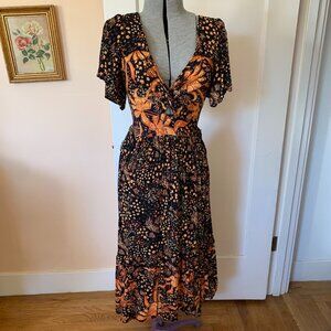 ANGIE Maxi Dress Sz S Boho Fall Floral Twist Front Ruffles Slit Flutter Sleeves