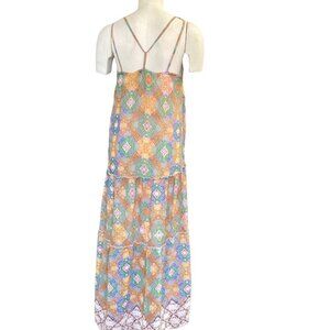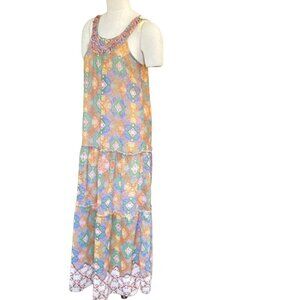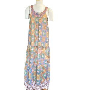 Description: BOHO Chiffon Colorful Maxi Dress with attached slip/lining, Strappy Tiered Sleeveless Beaded Sequined Embroidered Mixed Pattern