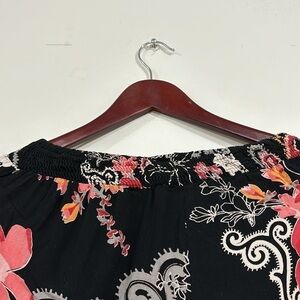 ANGIE Straight floral pants size S coral, black, white and yellow print, very comfortable pants with a light fabric, The measurements of the pants are: Length 37” inside the leg 26.5” rise at the waist 14” leg width 12.3 with spring at the waist, wide and comfortable pants