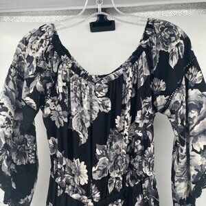 ANGIE Womens Floral Romper Long Belle Sleeves Lace Trim Black/Multi Size Medium
