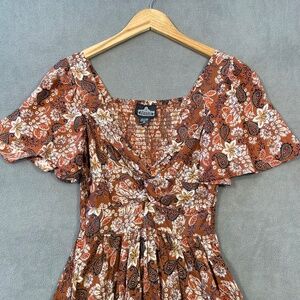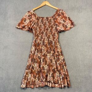 ANGIE Women’s Size Small Brown Floral V-neck Flutter Sleeve Smocked Back Dress