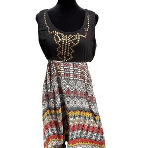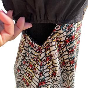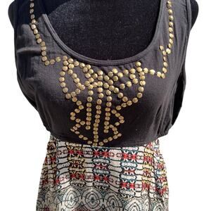 NWT ANGIE, women’s dress. Size M. Top is black with metal sequins. Skirt is multicolored and is 5” longer in back. A cutout with elastic is on each side where top & skirt attach.