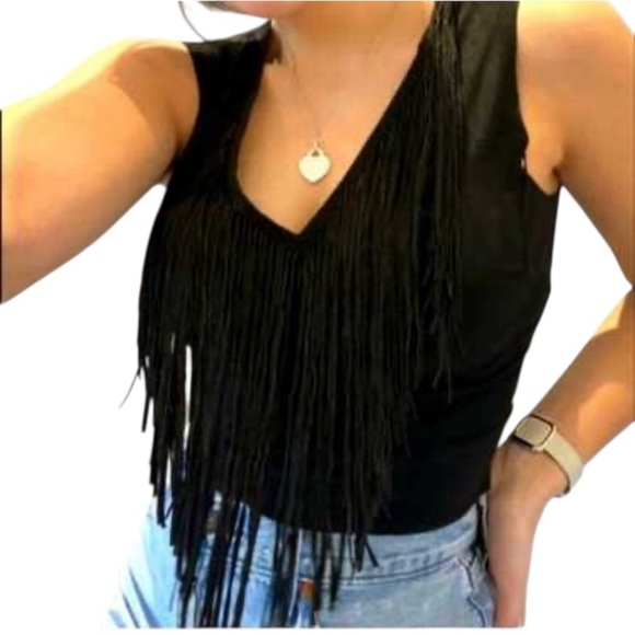 ANGL Black Fringe Sleeveless Body Suit plunging neck boho western cowgirl top