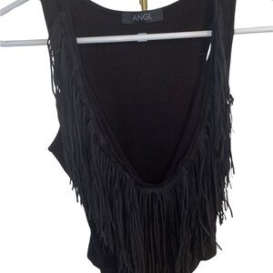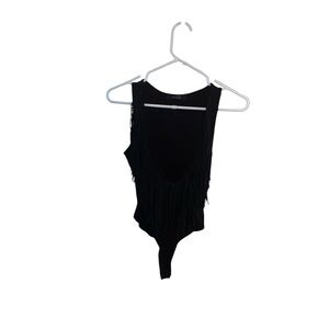 ANGL Black Fringe Sleeveless Body Suit plunging neckline boho western top