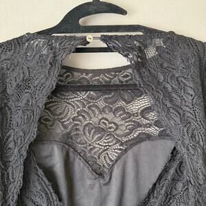 Pre-owned ANGL black lace jumpsuit, size small. Made in China. Features long sleeves, keyhole back, and a fitted silhouette. Fabric content: 90% nylon, 10% spandex; lining: 100% polyester. Shows minor signs of wear consistent with previous use. Measurements not provided. No significant flaws or damage observed.