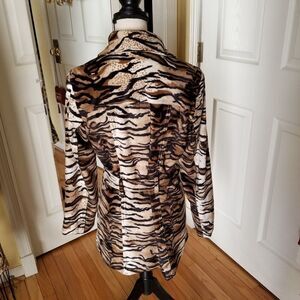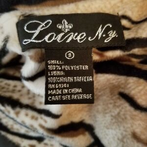 This is really a FUN coat to wear! It's medium weight with black satin lining. It measures 30" from back of neck to bottom. From the wide lapel V-neck down is 24". Sleeves are 23". Bust: 36. Waist: 32