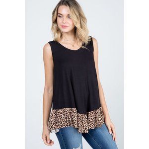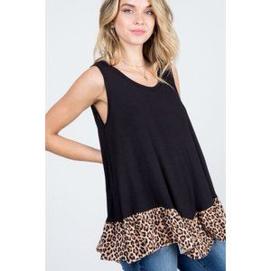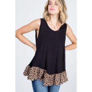 This sleeveless long tunic with animal print ruffle at the bottom is made to flare and swing with your body. the material is premium soft Rayon/Spandex.