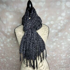 Beautiful scarf is semi sheer with overall animal print. Rows of shiny threads and fringe on ends. No tag or materials label attached.