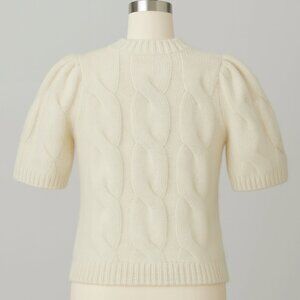 The Brittany Sweater is made from a heavyweight alpaca-wool yarn with an all-over cable stitch for a textured look and feel. It features a tight crew neckline and exaggerated puff short sleeves.