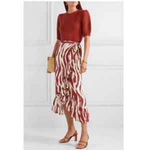 It's made from ivory crepe that looks as if it's been hand-painted w/ rust red zebra stripes. The flattering wrap silhouette has ruffled trims cascading down from the high-rise waist.