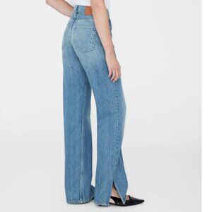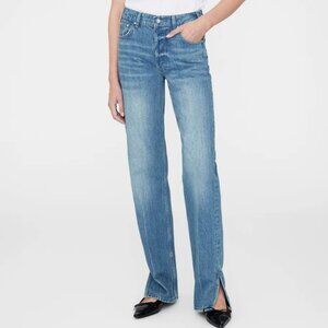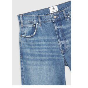Anine Bing Roy Jean is a midweight rigid organic cotton denim without stretch in a bright, medium blue wash with grinding, marbling, and vintage-inspired highs and lows throughout.