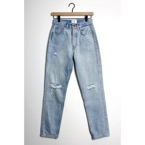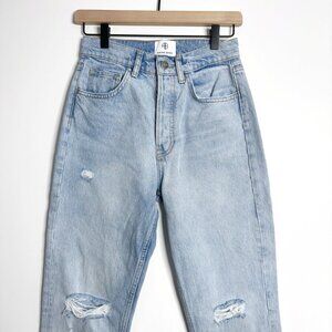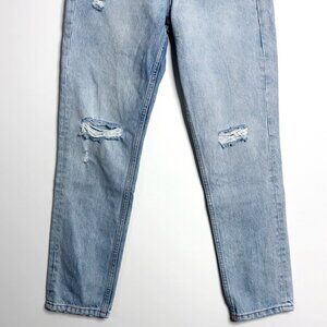 - Keywords: high rise, straight/tapered leg, distressed, destructed, rigid denim, light wash blue