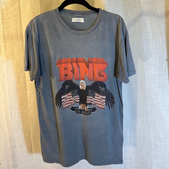 Super cool ANINE BING graphic tee in a washed charcoal grey with bold βBINGβ lettering and an eagle/American flag graphic. Classic AB rocker-inspired vibe with a naturally distressed, lived-in look. Oversized fit with a center back seam detail.
