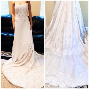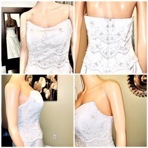 Be Princess-of-the-Day in this sweet & scintillating bridal gown in near pristine condition featuring a custom 3-tier scalloped bustier with built in bra having bone-in front and sides & a full flared train with lace detail & lots of sparkling crystals. Back zip & hook closure. Unaltered. Comes with Keepsake Box ($139 value)