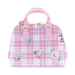 Charming Ank Rouge handbag featuring a rose and summer berry print over a pink and purple plaid pattern. Satin ribbons add a touch of femininity. Features functional inside pockets, sturdy handles, and a detachable shoulder strap. Imported from Japan. New with tags condition. Big enough to hold all your essentials! Smoke free home but we do have pets. BIN30
