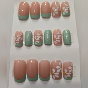 These nails are artificial nails that come pre-designed and pre-shaped to fit various nail sizes. My press-on nails offer a quick and convenient way to achieve salon-like nail designs without the need for professional application or extensive drying time. They come in a variety of colors, patterns, and designs, making them popular for special occasions or everyday wear. However, they may not last as long as professionally applied acrylic or gel nails and may require careful application and maintenance to ensure longevity. However, with proper prepping of your nails with my nail care kit your nails should last as needed. Nails can be re-used several times with proper care. This set comes with • 20-24 nails • Wooden cuticle pusher • Mini nail buffer • Alcohol pad or cuticle oil • Nail glue or adhesive glue • Instructions & how to apply So let's give your nails an upgrade!!!