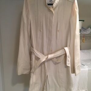 LIGHTWEIGHT CREME COLORED 3/4 LENGTH JACKET WITH BELT.