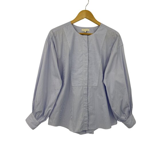 Ann Mashburn blue striped balloon sleeve blouse. Features long sleeves and a classic design. Size medium - fits a tad oversized.