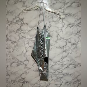 Shine bright in this metallic teddy featuring a lace-up front and princess seams.