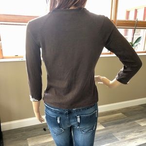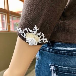ANN TAYLOR Collarless, three-quarter sleeve Silk cardigan. White beads/Ivory sequins at front enclosure and cuffs. Hook and eye enclosure. Materials: 65% Silk/ 17% Nylon/ 15% Cotton/ 3% Lycra