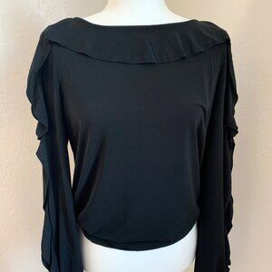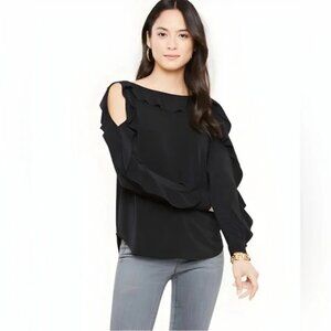 ANN TAYLOR Black Cold Shoulder Boatneck Ruffle Long-Sleeve Blouse Medium