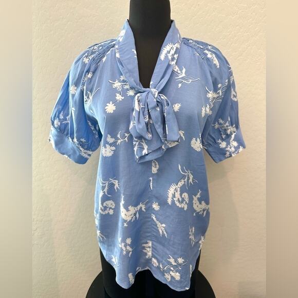 ANN TAYLOR | Blue & White Cottagecore Floral Neck Tie Puff Sleeve Blouse | XS