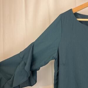 Boatneck. Long ruffle sleeves. Back slit with button closure. Lined body, unlined sleeves. Poly crepe in dark teal green.