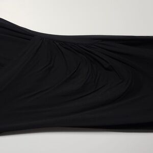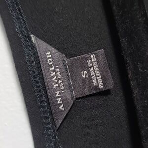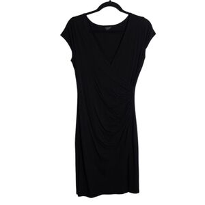 This sophisticated black sheath dress by Ann Taylor is perfect for a cocktail night out. Featuring a flattering v-neckline and cap sleeves, it offers a sleek silhouette that falls to a midi length. Its minimalist design ensures a timeless appeal, making it a versatile wardrobe staple.