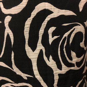 Exquisitely tailored with hidden side zip and hook close. Fully lined, beautiful fabric with a large graphic rose pattern in black and off-white.
