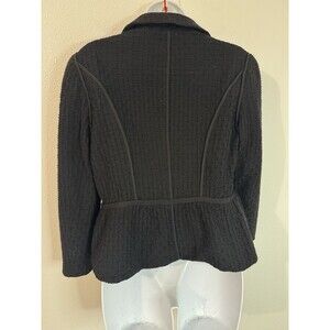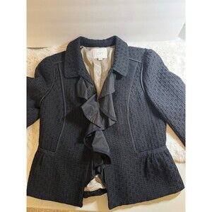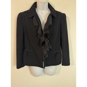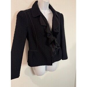 The Ann Taylor Loft Black Ruffled Collar Cropped Wool/Rayon/ polyester Jacket Blazer in size 10 is a stylish and versatile piece suitable for both casual and business occasions. Made from a luxurious blended fabric with a classic fit, this short jacket features a ruffled collar, hook and eye closure, and 3/4 sleeves. The cropped length adds a modern touch to the classic design, making it perfect for fall, winter, and spring seasons. This classic blazer exudes a minimalist yet designer feel, ideal for a career-oriented or preppy look. Jacket is in good Preowned condition with no obvious flaws holes or stains. Measurements in photos. I appreciate your business and strive for a five star rating. Please feel free to message with questions.