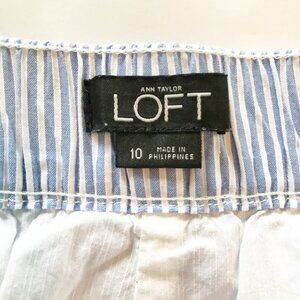 Ann Taylor Loft blue white striped seersucker side tie shorts. Button clasp & zip fly, faux front pockets, 2 back pockets, size womens 10, 100% cotton. Excellent pre-owned condition, no flaws or defects. Measurements in photos. Smoke and pet free home.