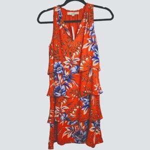 Ann Taylor LOFT Orange & blue floral tiered ruffle layered dress with cut-in shoulders and a keyhole button front.