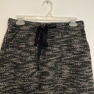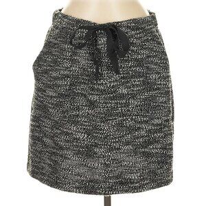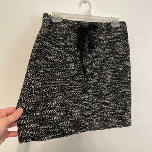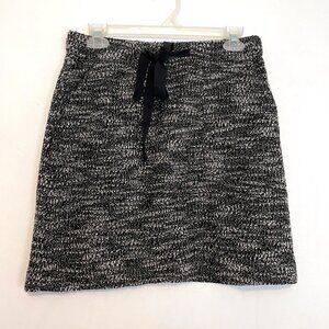◇ size PETITE small / SP / PS. Black and white marled. Textured boucle knit (almost a tweed - esque fabric). Seems to be high waisted high waist / high rise. Pull on / elastic waist with adjustable ribbon tie bow detail. Real front pockets. Approx short mini length or above knee length (depending on height). Mini skirt / a-line skirt