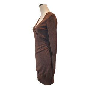 Brown, wool-blend knit sweater dress with a wrap-style front and long sleeves.