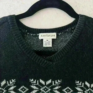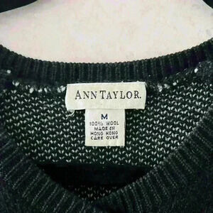 ANN TAYLOR M BLACK AND WHITE PRINTED WOOL V-NECK WINTER WARM COZY HEAVY SWEATER. 100% Wool, Long Sleeve, No Pilling noted. Size M