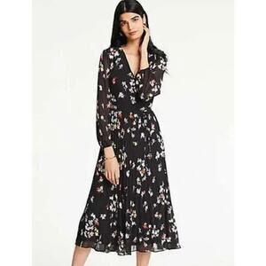 ANN TAYLOR Meadow Floral Accordion Wrap Dress Black Long Sleeve Women's 4 Petite