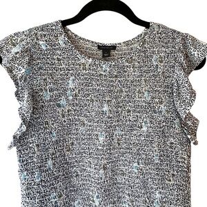 ANN TAYLOR NWOT FLUTTER SLEEVE SMOCKED FLORAL RUFFLE TOP NAVY BLUE WHITE | SM