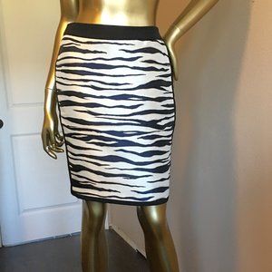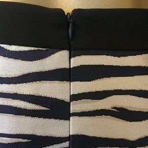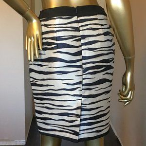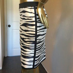 Gorgeous Zebra print fully lined skirt with black borders at waist and down each side. Hidden back zipper and back center vent. Cream, champagne/camel, blue fabric with the black borders.
