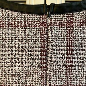 ANN TAYLOR, PLAID JACQUARD TUNIC. VERSATILE, SHORT SLEEVE TOP WITH LEATHER NECKLINE & 2 FRONT POCKETS TRIMMED IN LEATHER. HIDDEN ZIPPER. NO SIZE. MEASURES 19” ACROSS CHEST, 20” ACROSS BOTTOM, 24 1/2” LENGTH FROM SHOULDER TO BOTTOM OF TOP.