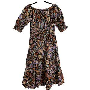 tags: romantic, dark romantic, boho, bohemain, vintage inspired, feminine, whimsical, natural, cottagecore, milkmaid, tiered, short sleeves, round neck, multicolor, colorful, ruffle accents, garden girl