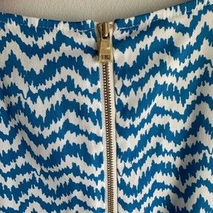 Ann Taylor Petites Turquoise Blue Chevron Sleeveless Ladies Casual Career Ladies Blouse. Exposed zipper in back. Has a little snag on the fabric as shown on the last photo only noticeable when up close.