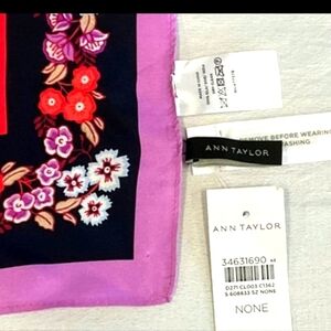 This ANN TAYLOR new with tags, silk scarf has lovely multi colored flowers on a black background with purple edging. Scarf has a hemmed edge (not rolled) and is 100% silk. Scarf is square and measures 42 inches x 42 inches. See photos.