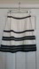 This knee-length A-line skirt showcases a sophisticated striped pattern, perfect for a casual or work setting. The structured fabric and tailored design offer a polished look, while the graduated stripe pattern adds a touch of modern elegance. Its versatile style makes it an ideal choice for various occasions. Ivory off-white cream with black and sheer mesh stripes. Fully lined. Concealed side seam zipper with hook and eye closure. Waist 27" Length 21" Excellent condition.
