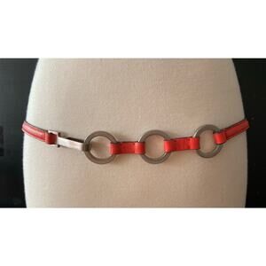 ANN TAYLOR Skinny Coral Leather Waist Belt w/Clasp Buckle size L. Featuring a sturdy rich coral leather strap and textured round silver buckles w/clasp closure. Perfect to wear over sweaters, dresses and oversized shirts.