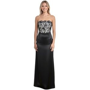 This stunning black evening gown features an exquisite lace bodice and a solid black floor-length skirt. The elegant design offers a timeless look. It is a formal strapless dress suitable for special occasions like weddings, prom, graduation or holiday parties.