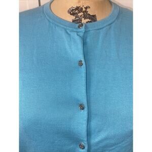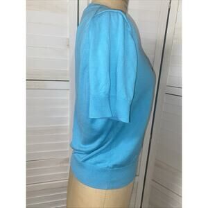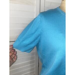 ANN TAYLOR Turquoise Knit Blouse Button Front Sz L Rayon Blend Career Silk Blnd