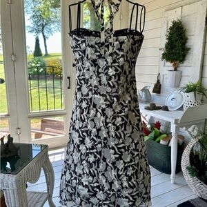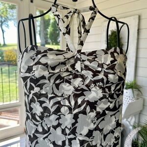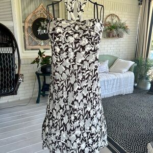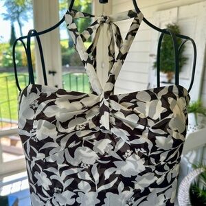 ANN TAYLOR, WOMENS, NWOT, SHEER OVER SILK, STRAPLESS/HALTER DRESS. STRIKING BROWN & IVORY FLORAL DESIGN. HIDDEN SIDE ZIP. FULL, FLOWY SKIRT. SIZE 4